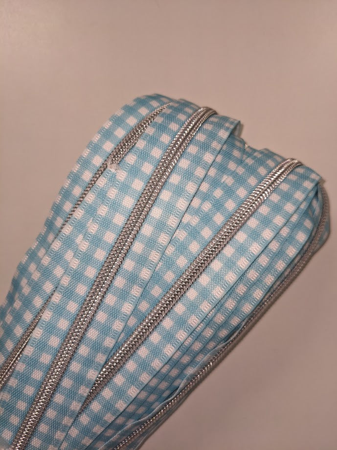 #5 Zippers By the Yard - Gingham Sky Blue with Silver Teeth