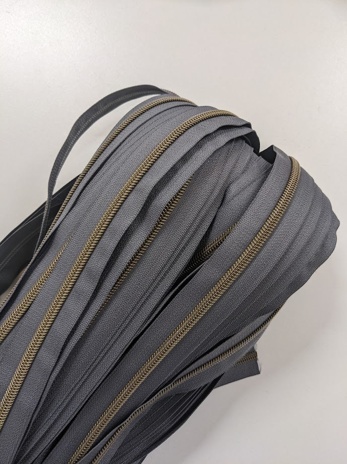 #5 Zippers By the Yard - Gray with Antique Brass