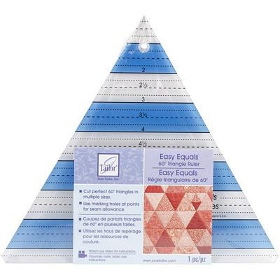 Cut 60-degree triangles in multiple sizes from 1in to 8in. Ruler is marked in half and quarter inch intervals.