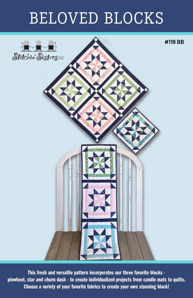 This fresh and versatile pattern incorporates our three favorite blocks – pinwheel, star, and churn dash. All three combined into one block is striking! Create individualized projects from a small candle mat to a beautiful quilt. Choose a variety of your favorite fabrics to create your own stunning block! The pattern provides complete instructions for the three models on the cover. Also included are samples and fabric requirements for a 12” x 64” table runner, 40” square and 51” square wall hangings along with full size and queen size quilts.