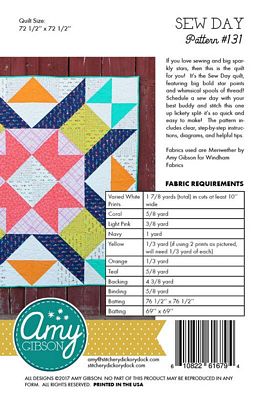 If you love big sparkly stars, then this is the quilt for you! The Sew Day quilt is 72.5'' square and features big bold star points and whimiscal spools of thread. Schedule a sew day with your best buddy and stitch this one up lickety split- it's so quick and easy to make! The beautful 12-page full color pattern booklet includes clear, step-by-step instructions, diagrams, and helpful tips. Fabrics used are Meriwether by Amy Gibson for Windham Fabrics.