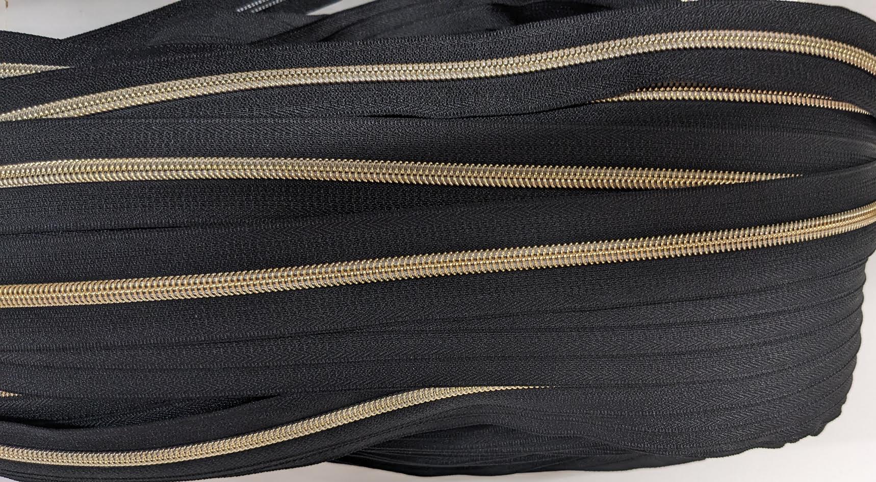 This zipper tape features nylon metallic-look zipper teeth in color Light Gold. The nylon coils make it very easy to sew on any home sewing machine. The zipper tape is color Black