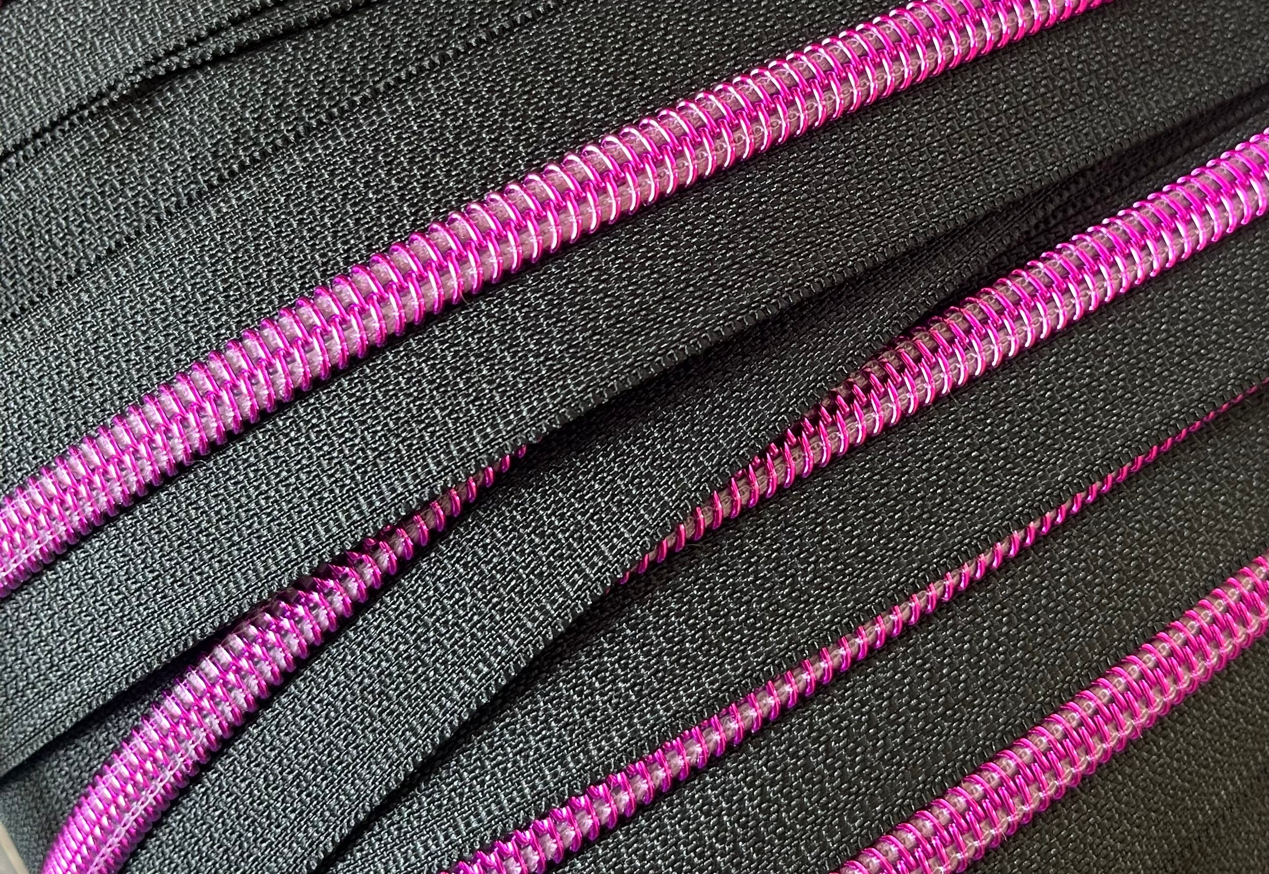 This zipper tape features nylon metallic-look zipper teeth in color Magenta . The nylon coils make it very easy to sew on any home sewing machine. The zipper tape is color Black