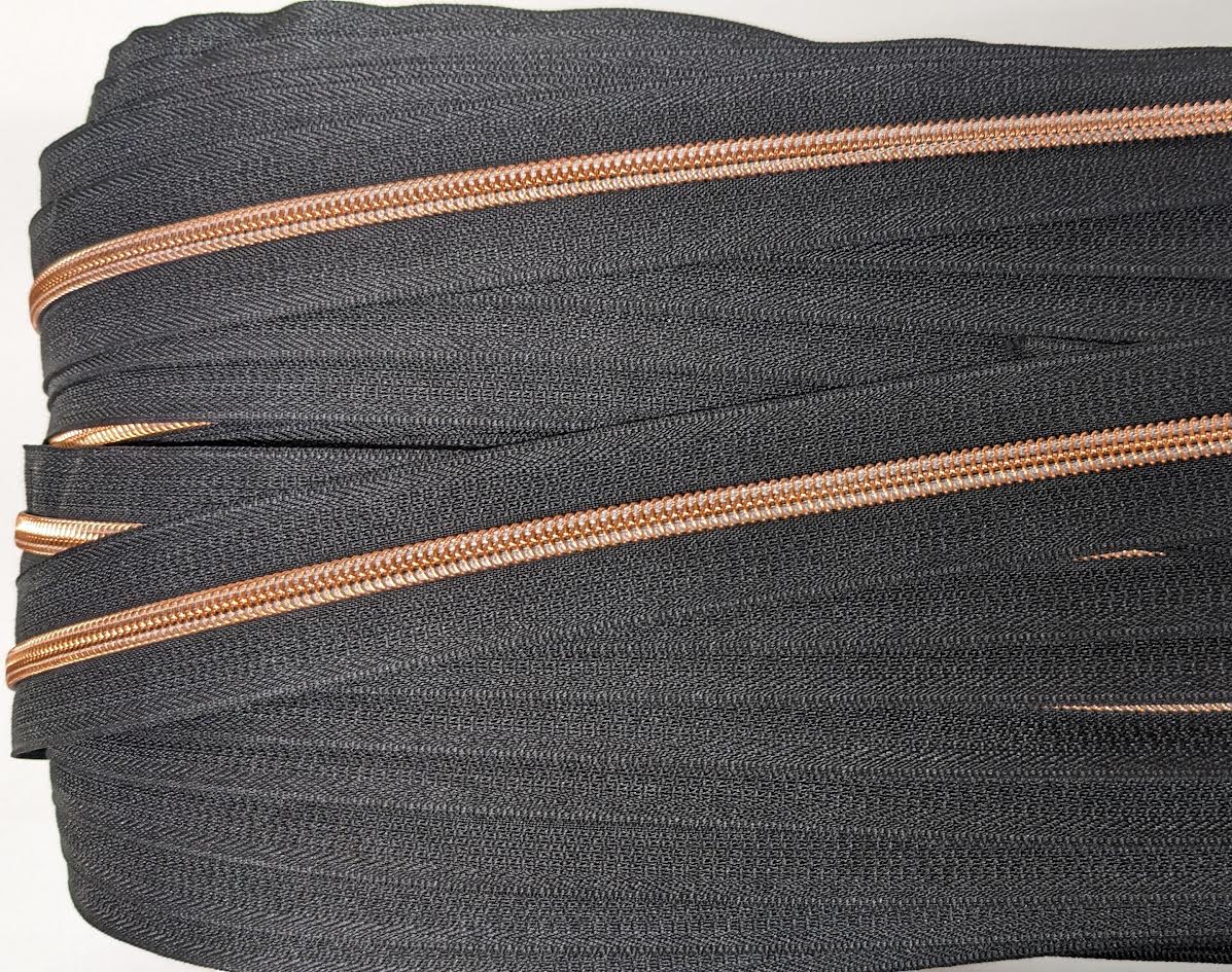 This zipper tape features nylon metallic-look zipper teeth in color Rose Gold . The nylon coils make it very easy to sew on any home sewing machine. The zipper tape is color Black