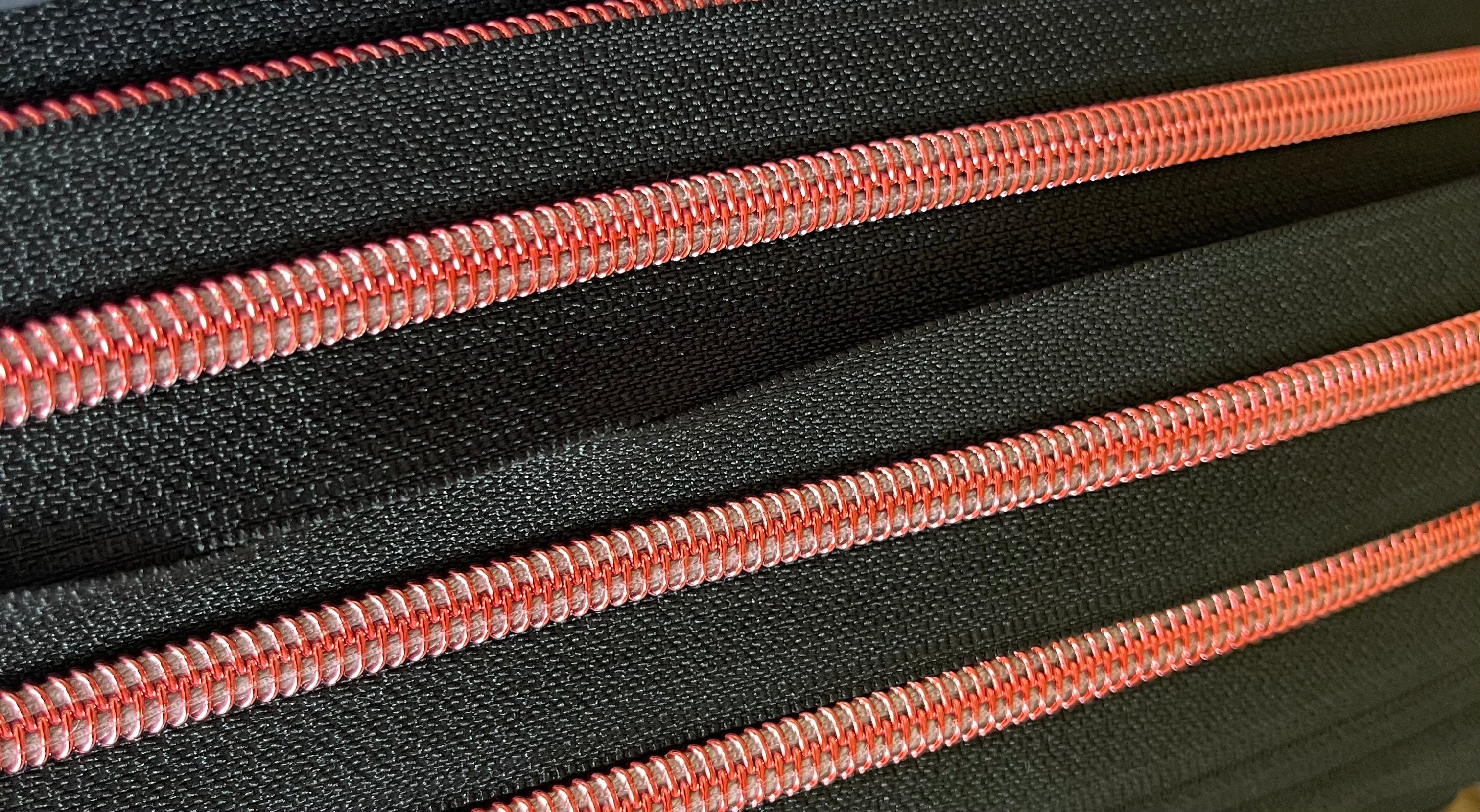 This zipper tape features nylon metallic-look zipper teeth in color Watermelon. The nylon coils make it very easy to sew on any home sewing machine. The zipper tape is color Black