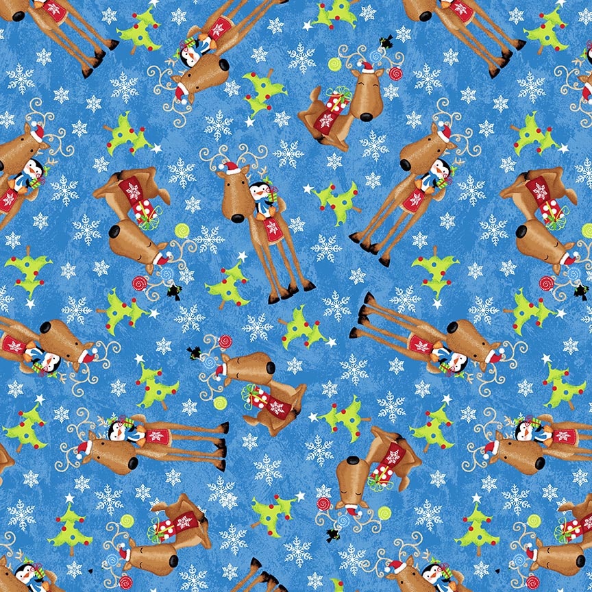 A Jolly Good Time is to be had with this collection. Snow falls down through the pale blue winter skies. Penguins stay warm while waddling in their scarves. Owls hoot with delight that it is almost Christmas time. Santa is nearby with gifts for all as his reindeer prepare for a cold flight in the night. Gather your hat and scarf to stay warm as you quilt with A Jolly Good Time.