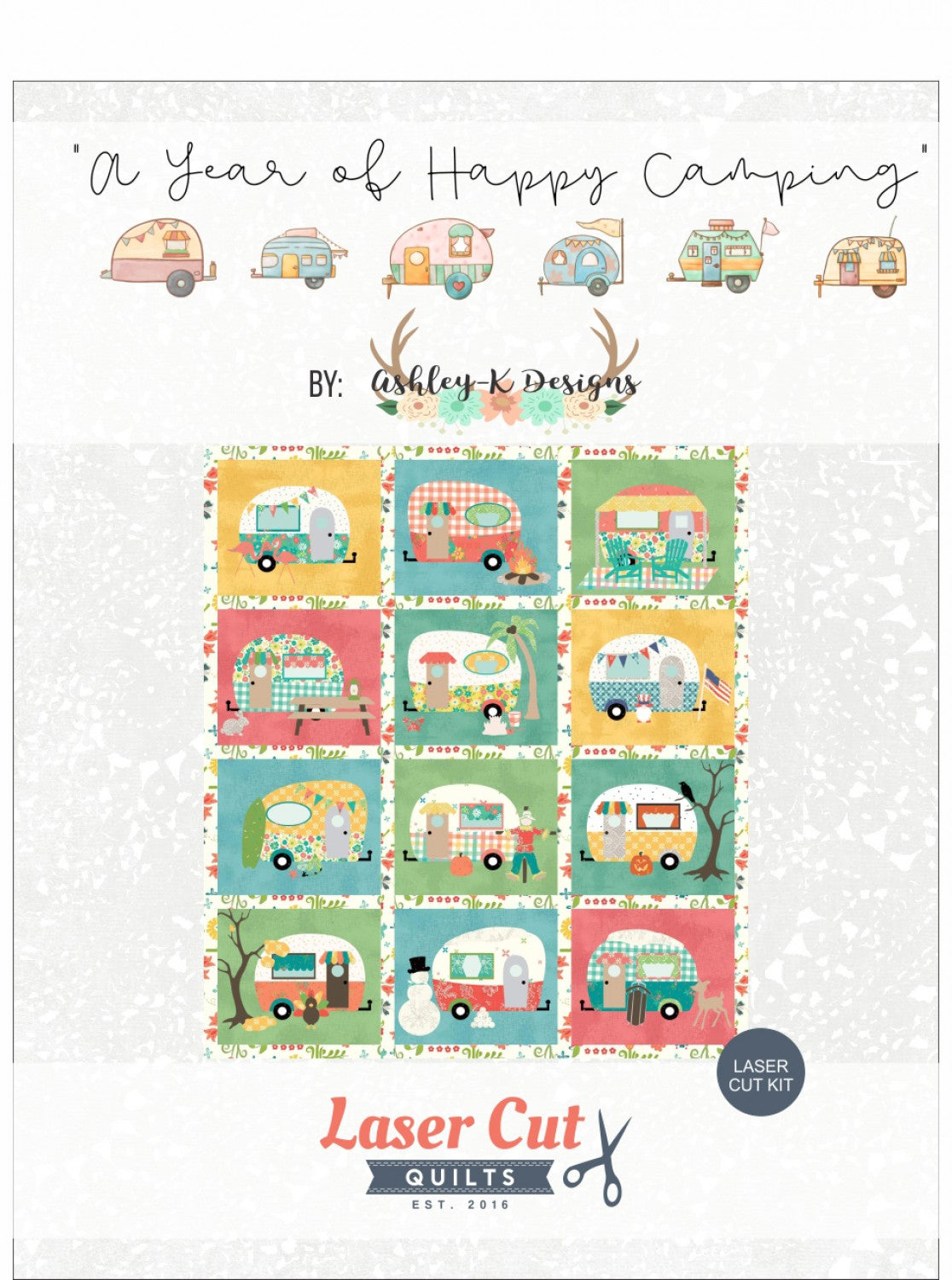 "A Year of Happy Camping" features bright pinks, sunny yellows, and vibrant turquoise as each camper takes us through the months and seasons!This kit includes all twelve blocks shown in Riley Blake fabric, all applique is included pre-cut and pre-fused with FlexiFuse premium fusible. Finished Size: 52" x 57"
