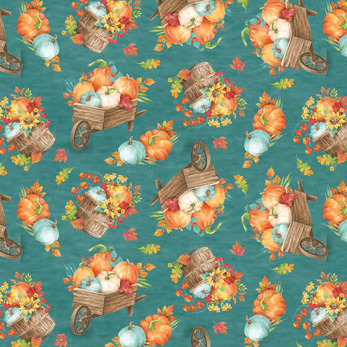 Autumn Blessings by Silas M. Studio for Blank Quilting - 3316-67 Teal - Teal Autumn Wheelbarrows & Cornucopias - sold in 1/4 yard increments