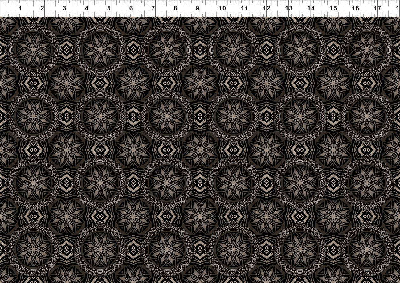 Black, grey, and tan geometric medallions arranged in a grid across a grey background. There’s nothing quite as majestic as a dragon! Enter a world of fantasy fabrics full of dragons, castles, fire breath, and more with this mystical collection.