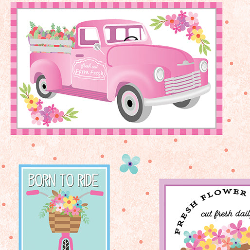 Whether you prefer pedal power or zooming down the open road you are sure to Enjoy the Ride with these fabrics. A cute and quirky panel, large-scale all-over print, and border stripe (for quick and easy quilts) are combined with word prints, florals, and more to create a collection that is upbeat and happy! Let the good times roll in your sewing room while you create projects for any adventure.