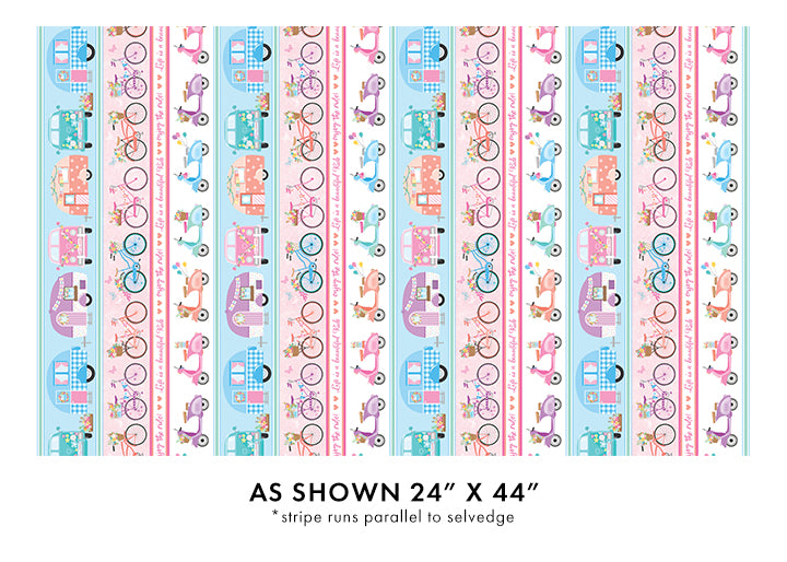 Whether you prefer pedal power or zooming down the open road you are sure to Enjoy the Ride with these fabrics. A cute and quirky panel, large-scale all-over print, and border stripe (for quick and easy quilts) are combined with word prints, florals, and more to create a collection that is upbeat and happy! Let the good times roll in your sewing room while you create projects for any adventure.