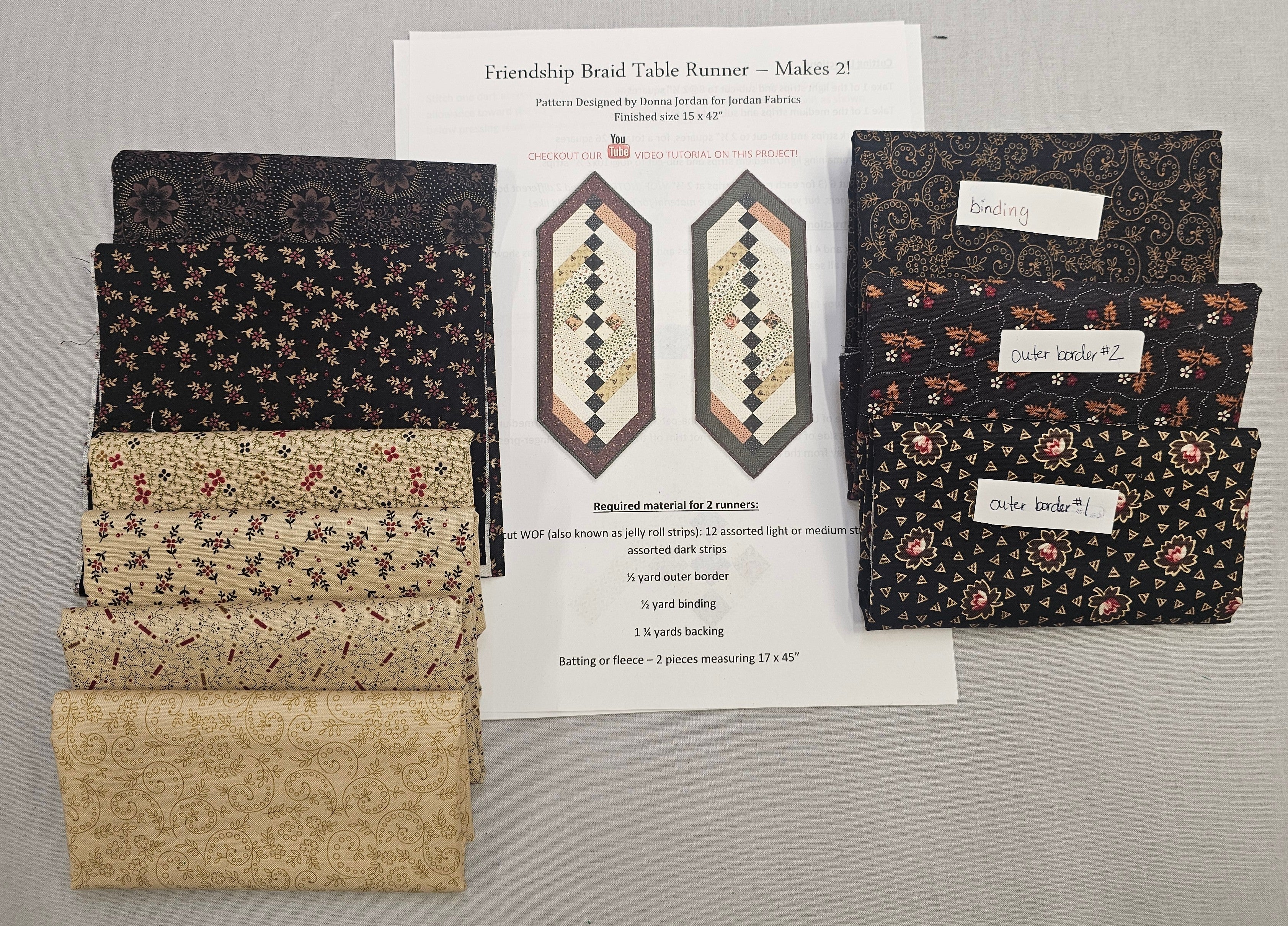 Friendship Braid Table Runner kit includes fabric for top and binding for 2 table runners. Uses fabrics from the Butternut & Peppercorn Fabric Collection from Marcus Fabrics. Pattern is included and was designed by Donna Jordan of Jordan Fabrics.