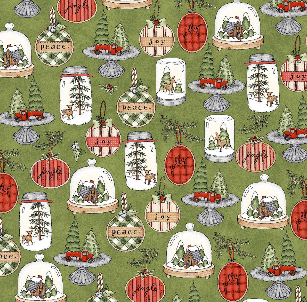 Mason jar dioramas, candy-filled saltshaker snowmen, and traditional Scandinavian straw stars – Homemade Holidays by Kris Lammers is for the creative crafter in all of us. A bit nostalgic and altogether inspirational, this darling novelty group will have you reminiscing about those favorite holiday crafts from your childhood. The sweet gingham check gives the collection a cottagey feel and the range of greens and reds make charming vintage patchwork projects. Use the small-scale prints to stich up stuffed ornaments and gifts. The patchwork print is perfect for stockings filled with your homemade decorations. The centerpiece of the collection is running yardage of patches – each one showcasing an adorable homemade craft.