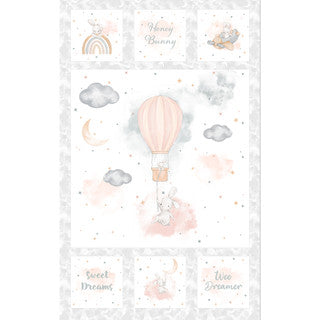 Honey Bunny features a soothing palette for all wee dreamers with gentle grey tones, soft peaches, and delicate whites. Playful scenes of rainbows and hot air balloons evoke the wonder of childhood adventures, while floppy ears and fluffy clouds add a touch of whimsy. Perfect for sewing sweet nursery quilts and soft baby gifts, Honey Bunny invites you to create comforting, handmade treasures for the littlest ones in your life.