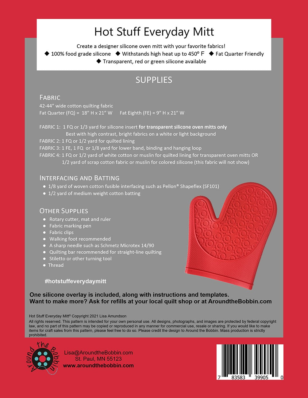 Create a designer silicone oven mitt with your favorite fabrics. Red silicone overlay, instructions and templates included. Makes one oven mitt approx. 12in x 7-1/2in. Silicone overlay is 100% food grade silicone and heat resistant up to 450 degrees. Has a great grip and can be washed off in the kitchen sink. Refill silicone overlays available.