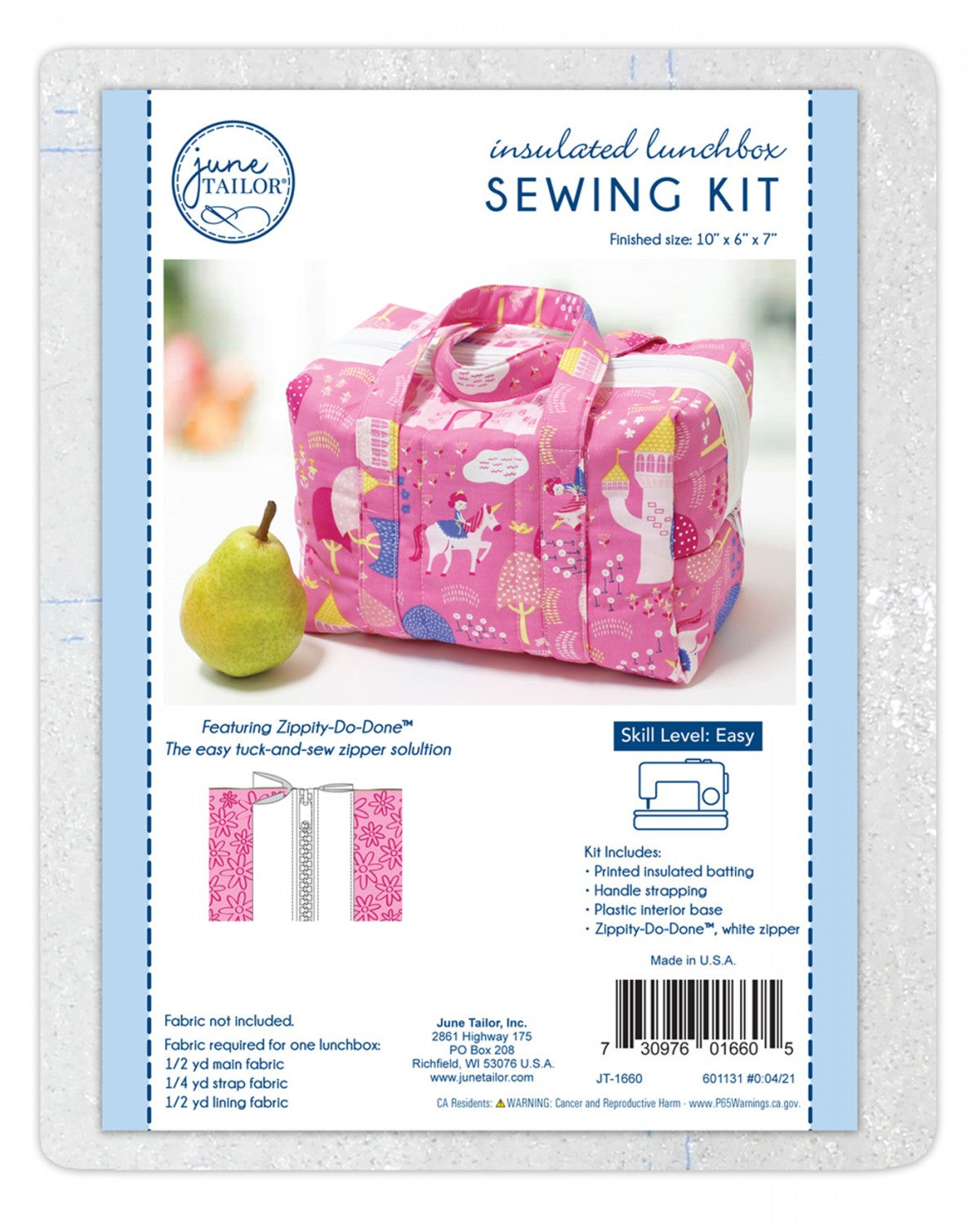 This stylish insulated lunchbox sews up quickly. With finished dimensions of 10 x 6 x 7 inches, this large bag can easily hold lunch for two. Kit includes insulated stabilizer printed with sewing pattern, Zippity-Do-Done™ pre-sewn zipper in Navy, webbing for handles, plastic interior base for added bag stability and detailed instructions.