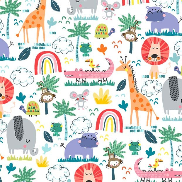 Jungle Safari is an adorable, 17-piece collection with jungle animals reminding us to “Be Brave”, “Be Kind” and “Hang in There”. Giraffes, monkeys, lions and more are on display in an on-trend color story, perfect for any nursery or jungle-themed room. The 36” Jungle Safari Panel makes a quick baby quilt or wall hanging.