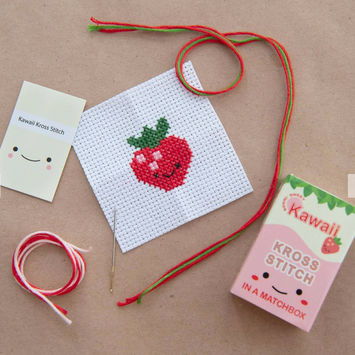 A super cute cross stitch kit gift, with a cool Strawberry pattern perfect for beginners or enthusiasts wanting a quick project. Everything you need to make this mini Kawaii style Strawberry cross stitch pattern is packed neatly into a matchbox.