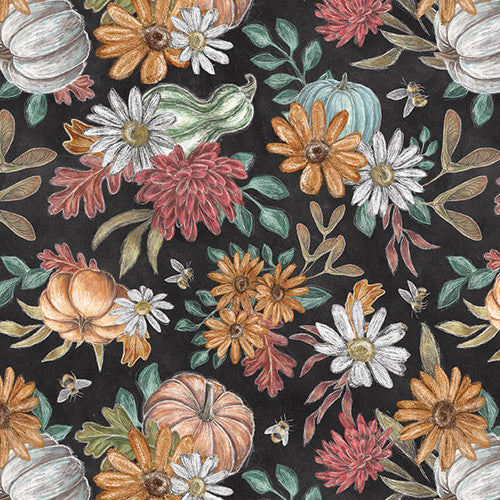 Late Summer Harvest by Lily Ford for Blank Quilting - 3307-99 - Charcoal Pumpkins with Flowers - Sold in 1/4 yard increments