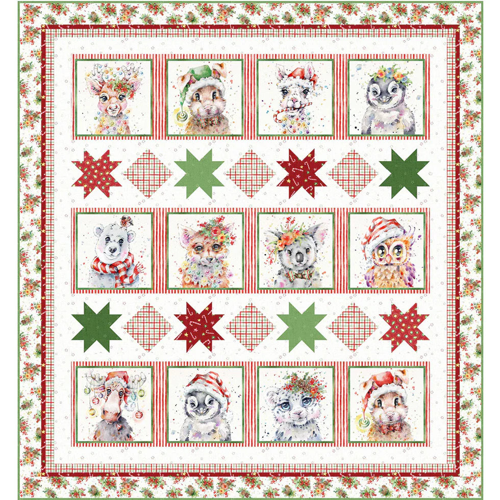 This Christmas Friends Quilt by Wendy Sheppard measures 54.5" x 58.5". It features the Little Darlings Christmas collection by Sillier Than Sally Designs for P & B Textiles.