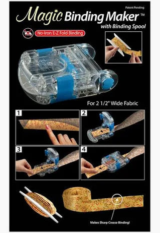 2.5" Magic Binding Maker makes making custom binding easier than ever, with no ironing required. Simply fold the end of your 2.5" binding fabric and feed it through the magic binder. Then pull it through for easy single folded binding without ironing. This nifty notion also comes with a binding spool for wrapping and storing your binding.