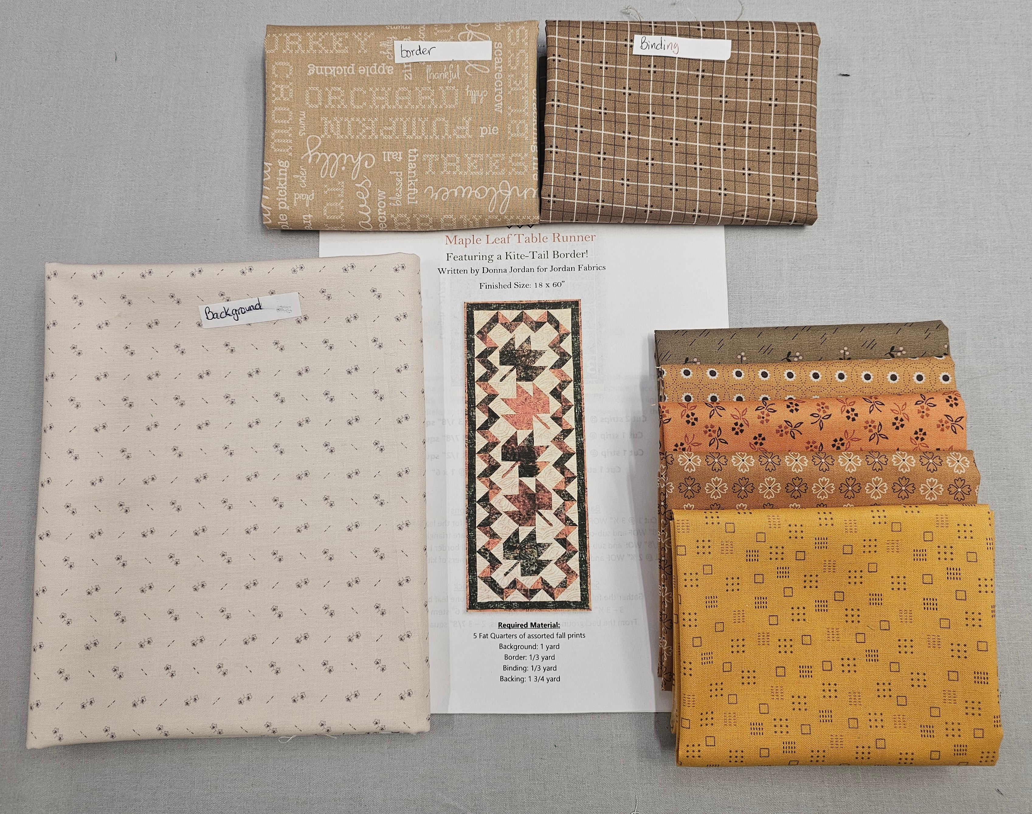 Maple Leaf Table Runner kit includes fabric for top and binding for 1 table runner. Uses fabrics from the Autumn Fabric line by Lori Holt at Riley Blake Designs. Pattern is included and was written by Donna Jordan of Jordan Fabrics.