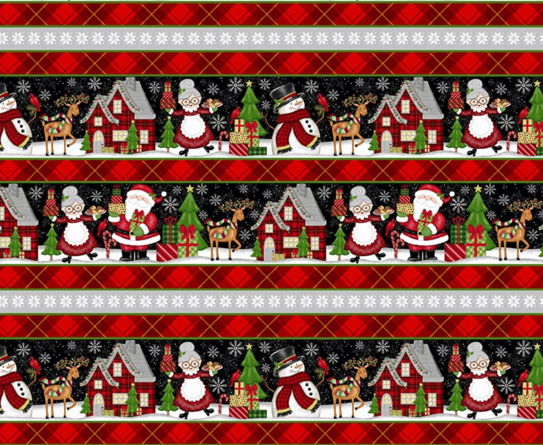 "Merry Town” is a holiday themed collection designed for Studio E Fabrics by Sharla Fults. This collection features a large Santa Claus and Mrs. Claus 36” x 44” panel, a 6 block design, a packed characters design, a tossed snowman allover, a tossed characters print, a diagonal plaid in two colors, a tossed snowflake pattern, a tossed string of lights design and a border stripe. The main colors used in this collection are black, red, green, and gray.
