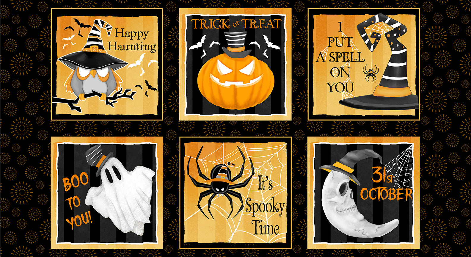 Shelly Comiskey has adjusted her Halloween color palette to be a bit more sophisticated. This line features traditional orange, black, some gray and white (which will be where the glow is). Taking the theme from the folklore of the Salem Witch Society, there are witches riding brooms in the moonlight, black cats in pumpkins, witch hats, spider webs and ghosts. Shelly has also added a 36” panel with two trick or treat bags. All 14 skus in this line have glow in the dark.