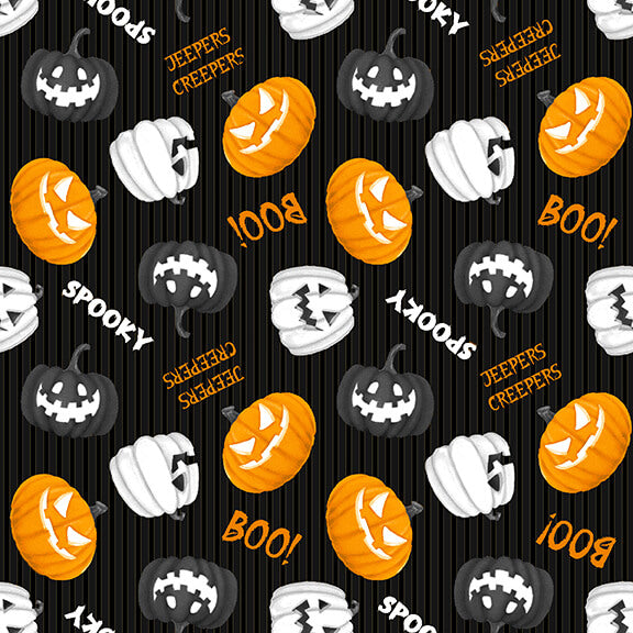 Shelly Comiskey has adjusted her Halloween color palette to be a bit more sophisticated. This line features traditional orange, black, some gray and white (which will be where the glow is). Taking the theme from the folklore of the Salem Witch Society, there are witches riding brooms in the moonlight, black cats in pumpkins, witch hats, spider webs and ghosts. Shelly has also added a 36” panel with two trick or treat bags. All 14 skus in this line have glow in the dark.