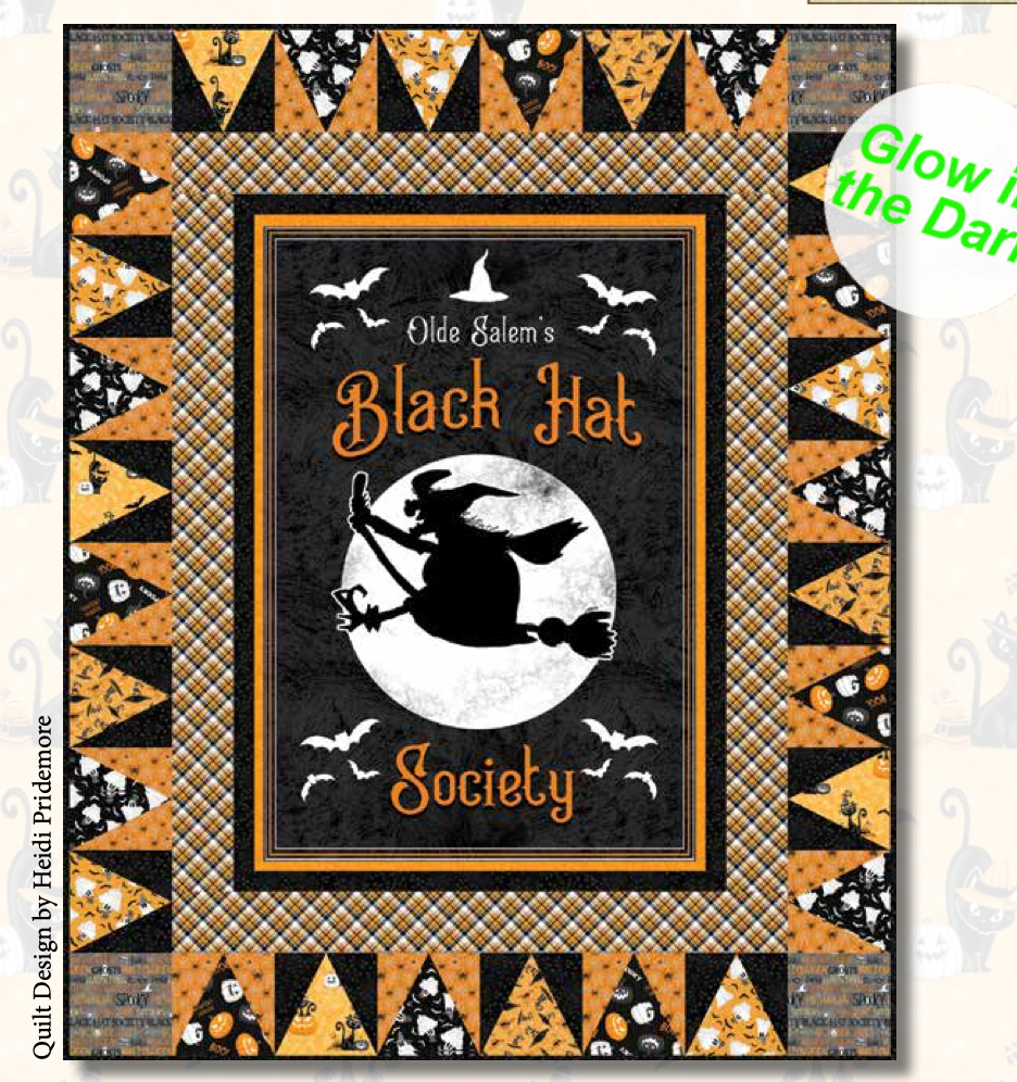 Shelly Comiskey has adjusted her Halloween color palette to be a bit more sophisticated. This line features traditional orange, black, some gray and white (which will be where the glow is). Taking the theme from the folklore of the Salem Witch Society, there are witches riding brooms in the moonlight, black cats in pumpkins, witch hats, spider webs and ghosts. Shelly has also added a 36” panel with two trick or treat bags. All 14 skus in this line have glow in the dark.