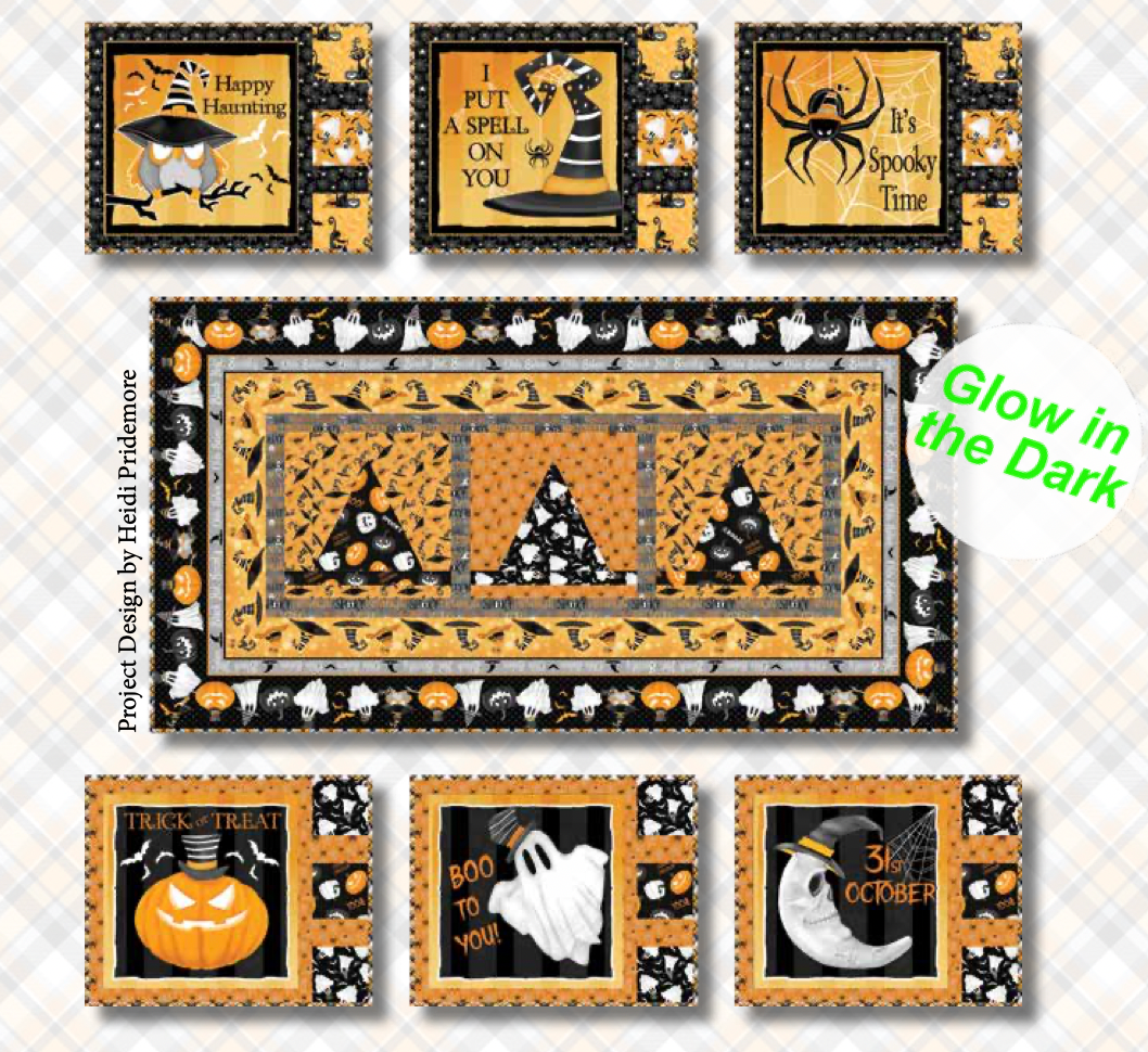 Shelly Comiskey has adjusted her Halloween color palette to be a bit more sophisticated. This line features traditional orange, black, some gray and white (which will be where the glow is). Taking the theme from the folklore of the Salem Witch Society, there are witches riding brooms in the moonlight, black cats in pumpkins, witch hats, spider webs and ghosts. Shelly has also added a 36” panel with two trick or treat bags. All 14 skus in this line have glow in the dark.