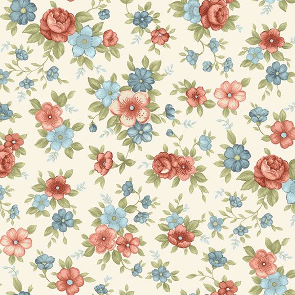 Tracy Souza brings us a sweet collection of gentle florals in varied shades of terra cotta and slate blue. These tones blend with cream to give a slightly antiqued patriotic feel. She highlights the group with a whimsical, ready-to-stitch sampler panel in each colorway
