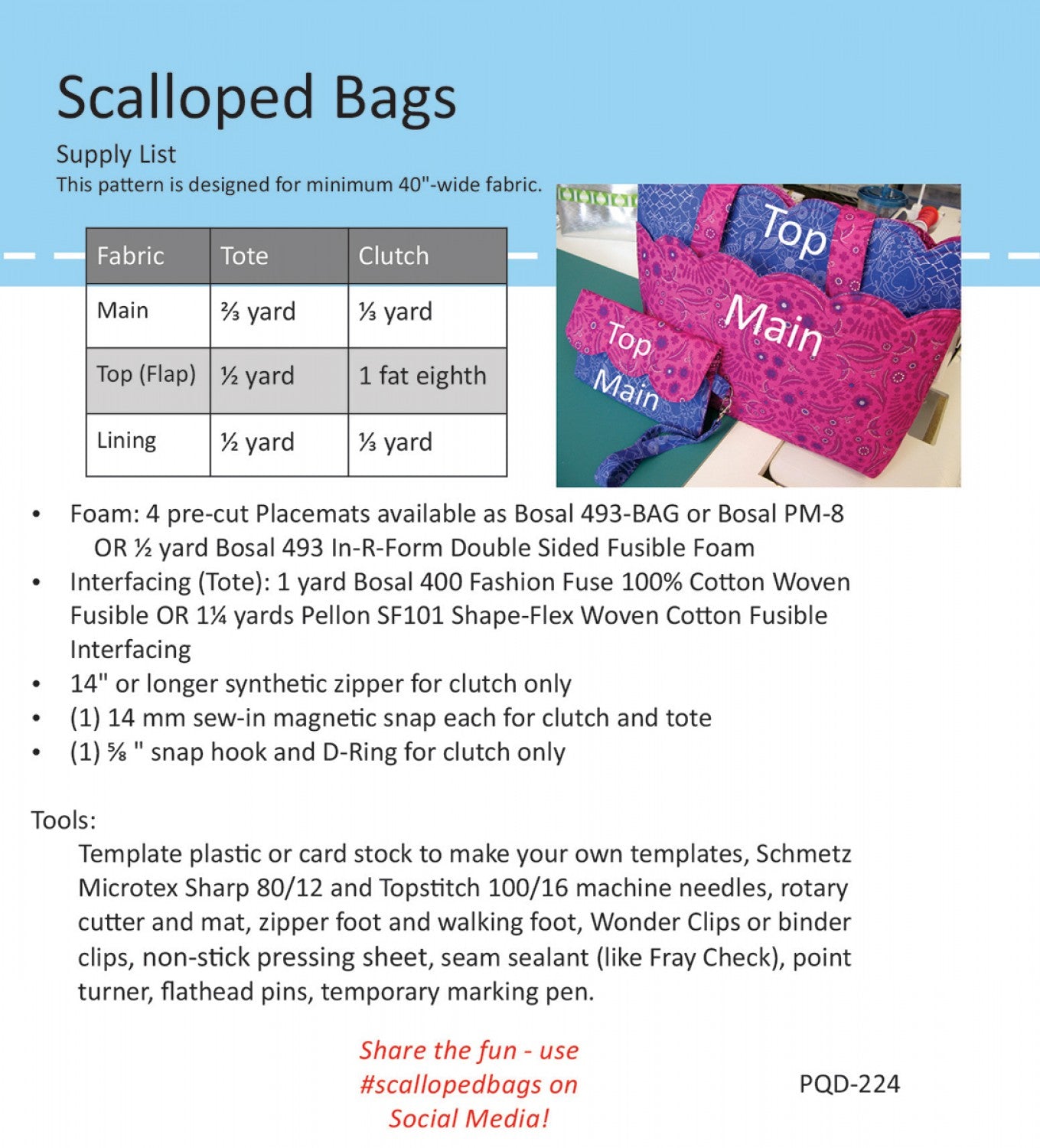 These Scalloped Bags are so much fun to make, and we make them with a no binding technique! Kit these up with Bosal's pre-cut scalloped placemat packs - one pack makes the tote and the clutch. Tote 16in x 11-1/2in x 3in deep, Clutch 8-1/2in x 5in x 1/2in deep