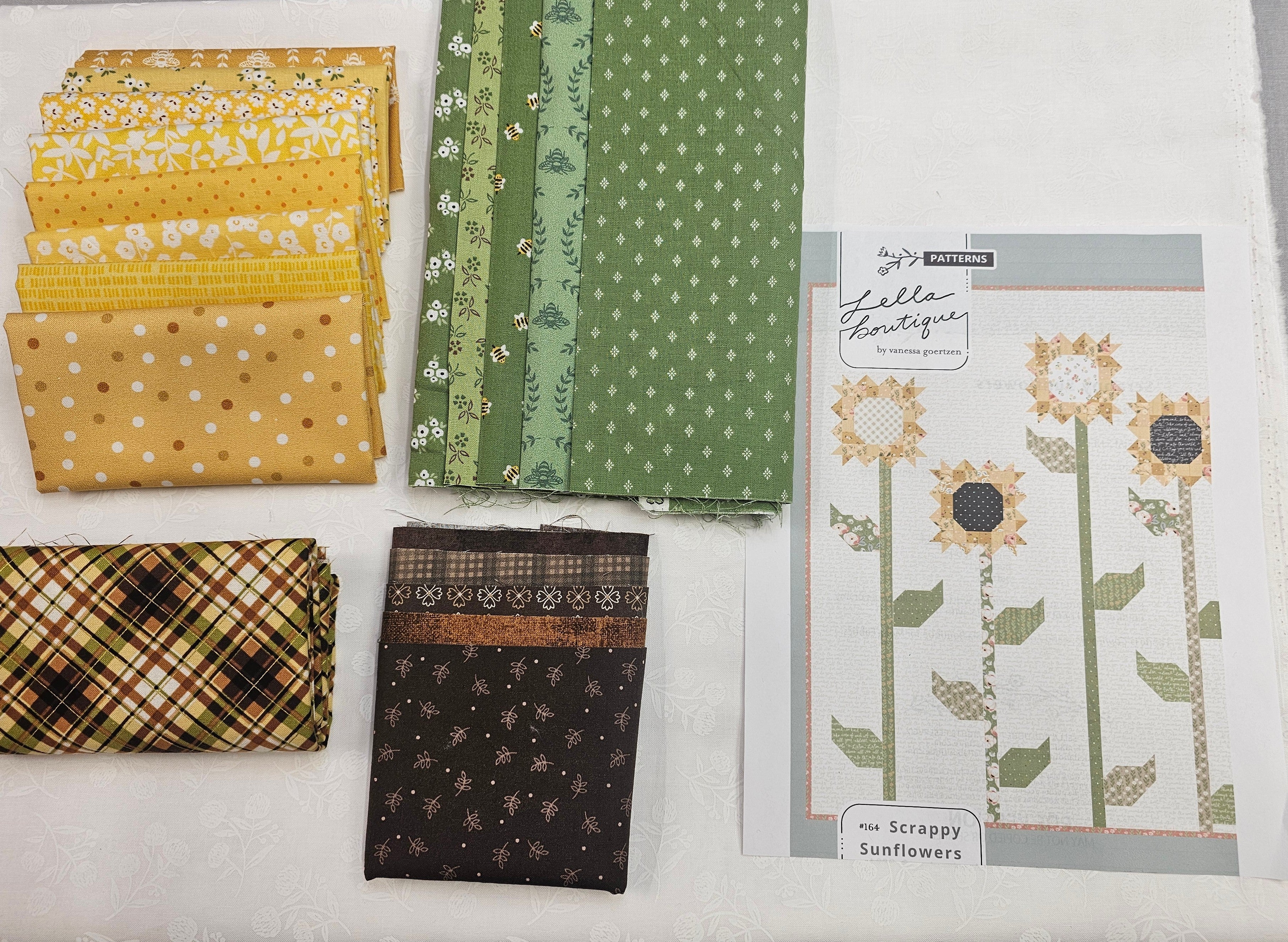 Scrappy Sunflowers Quilt kit includes fabric for top and binding. Uses Assorted yellows, browns, and greens for the scrappy sunflowers. Pattern is included.