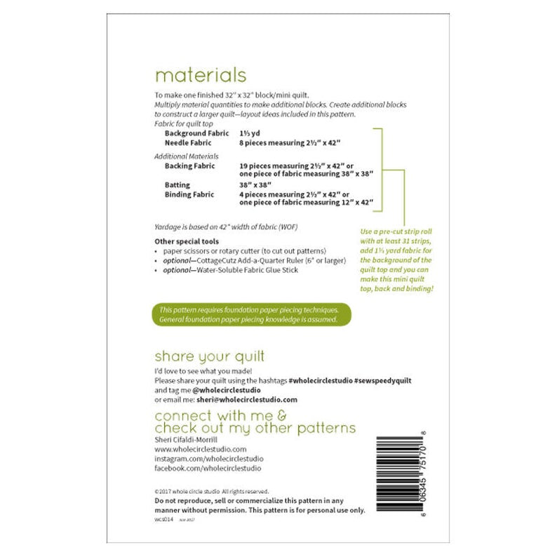 Sew Speedy is a graphic wallhanging / mini quilt that uses foundation paper piecing techniques. Make additional blocks to make a larger quilt (layout ideas are provided). Sew Speedy is pre-cut strip friendly! Use a pre-cut strip roll (with at least 31 strips), add 1⅓ yard fabric for the background of the quilt top and you can make this mini quilt top, back and binding!A great mini quilt to make as a wall hanging for your sewing space or gift to a sewist!