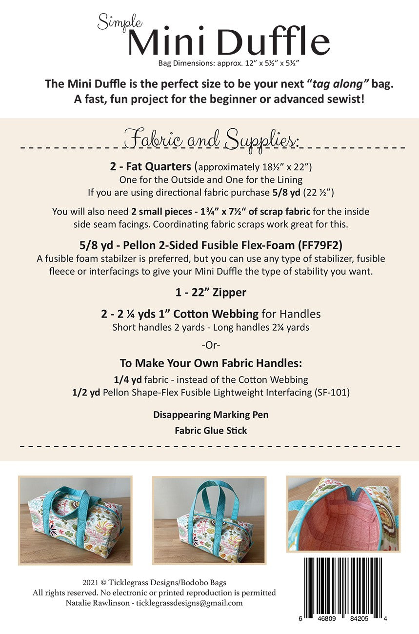 SPECIAL FEATURES: Quick project - The Mini Duffle is the perfect size to use as a purse, small tote, toiletry bag and more! French Seam Box Corners. Fat Quarter Friendly. This pattern does not include paper templates. Fabric is meant to be cut using a rotary cutter, mat and ruler.