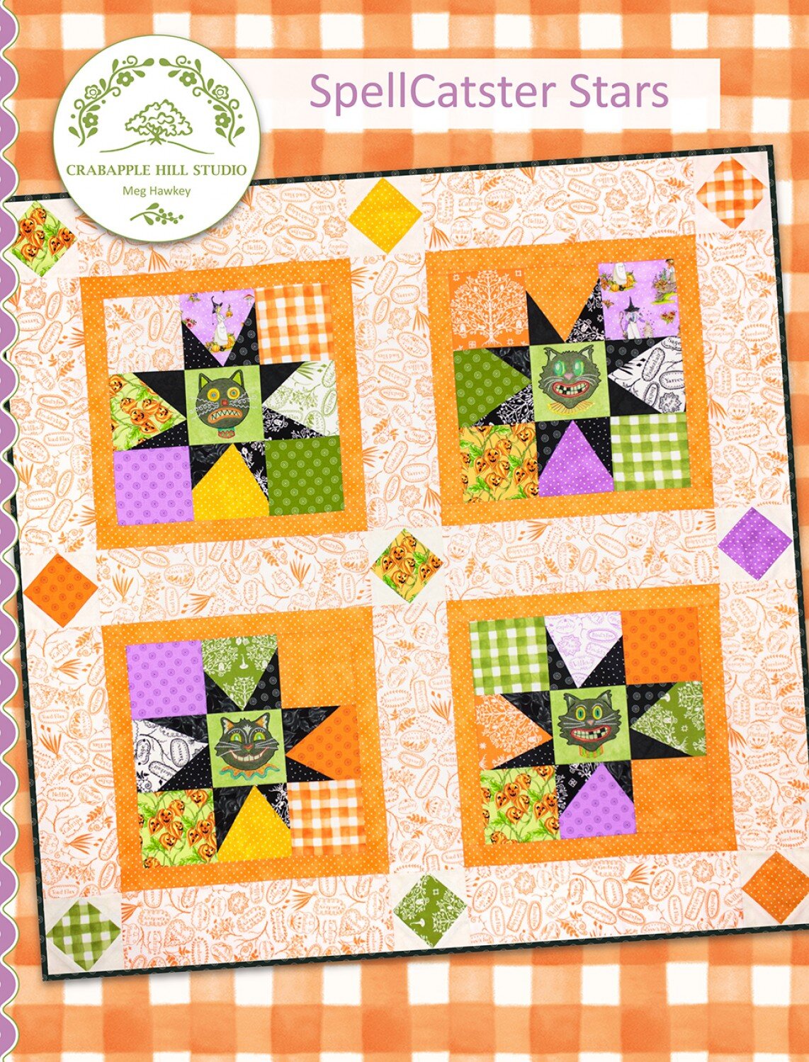 Vintage style Halloween Cats center the wonky pieced star blocks on this quick and easy quilt. They’re just SO MUCH fun! The pattern is for hand embroidery with colored pencil tinting.