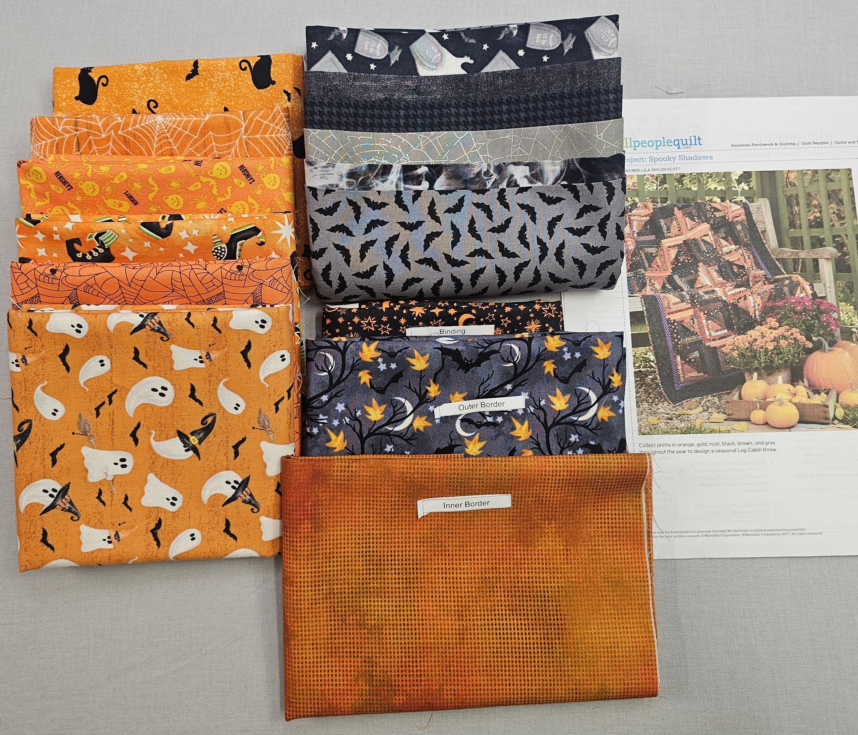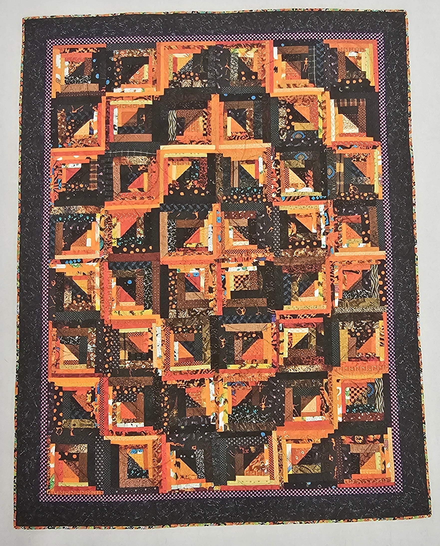Spooky Shadows Log Cabin Quilt Kit. Uses Assorted oranges, greys, and blacks for the scrappy log cabin. Pattern is included.