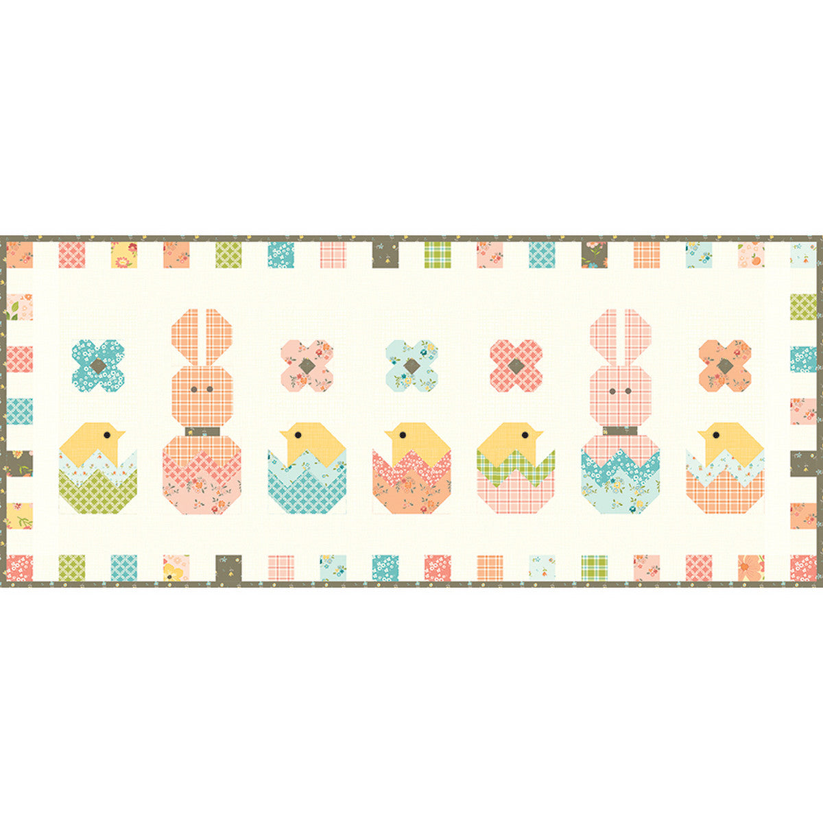 The Hatchery Hack Runner by Sandy Gervais of Pieces from My Heart is 10-inch stacker friendly and features pieced bunnies and chicks hatching from eggs. Finished size is 19 1/2" x 46 1/2".