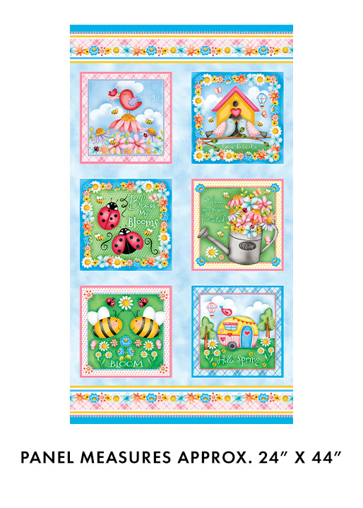 Sunshine Days heralds the joy and excitement that spring and summer can bring. Sweet motifs of campers, birds, florals and insects in brightly colored shades of pink, yellow, and blue are paired with pretty plaid coordinates. The word prints and sentiments used in the blocks like "Bless My Blooms" and "Bloom Where You Are Planted" give the collection a sense of fun and playfulness. These fabrics are sure to resonate with lighthearted nature lovers everywhere.