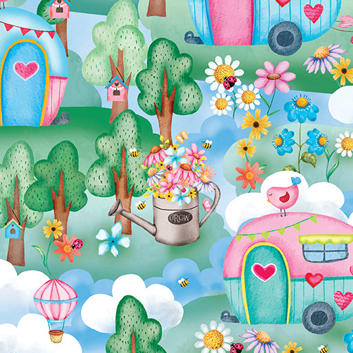 Sunshine Days heralds the joy and excitement that spring and summer can bring. Sweet motifs of campers, birds, florals and insects in brightly colored shades of pink, yellow, and blue are paired with pretty plaid coordinates. The word prints and sentiments used in the blocks like "Bless My Blooms" and "Bloom Where You Are Planted" give the collection a sense of fun and playfulness. These fabrics are sure to resonate with lighthearted nature lovers everywhere.