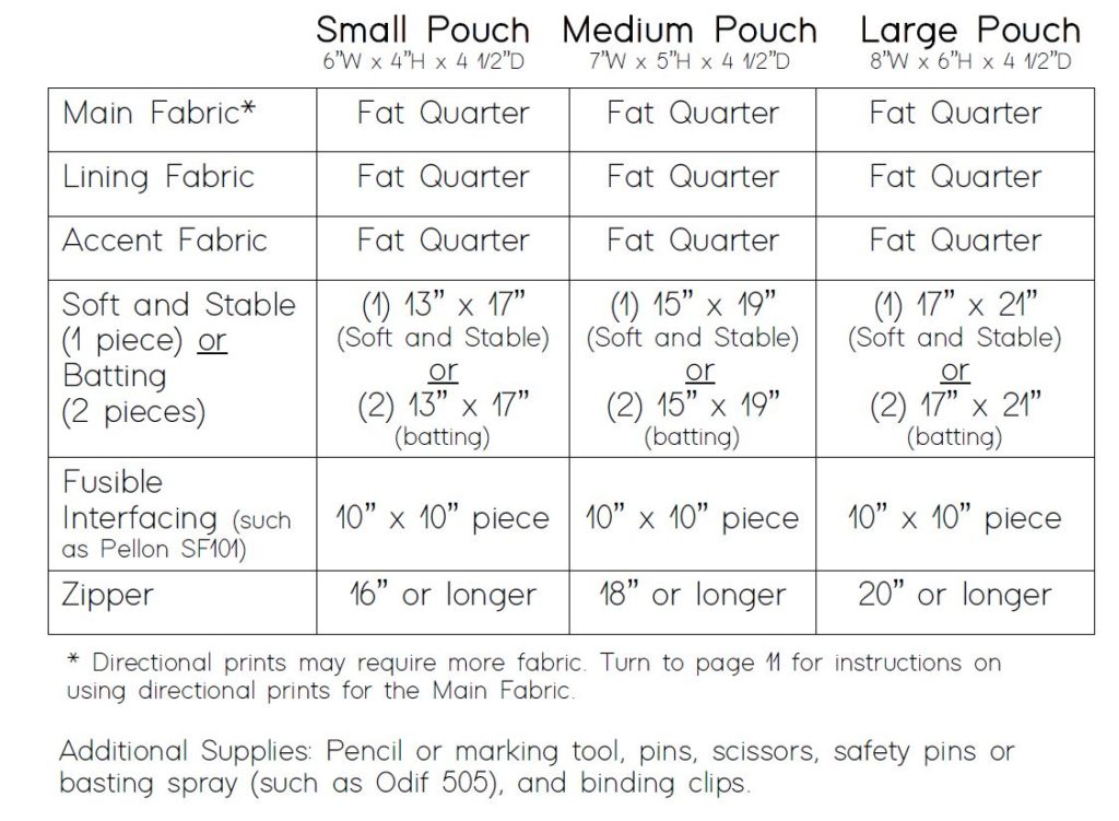 The Holland Pouch pattern has three size options, each of which only uses three fat quarters of fabric. The pattern includes full color, step-by-step graphics walking you through every step of creating your pouch, plus extra instructions for using directional fabric (we don't want any upside down prints now, do we?).