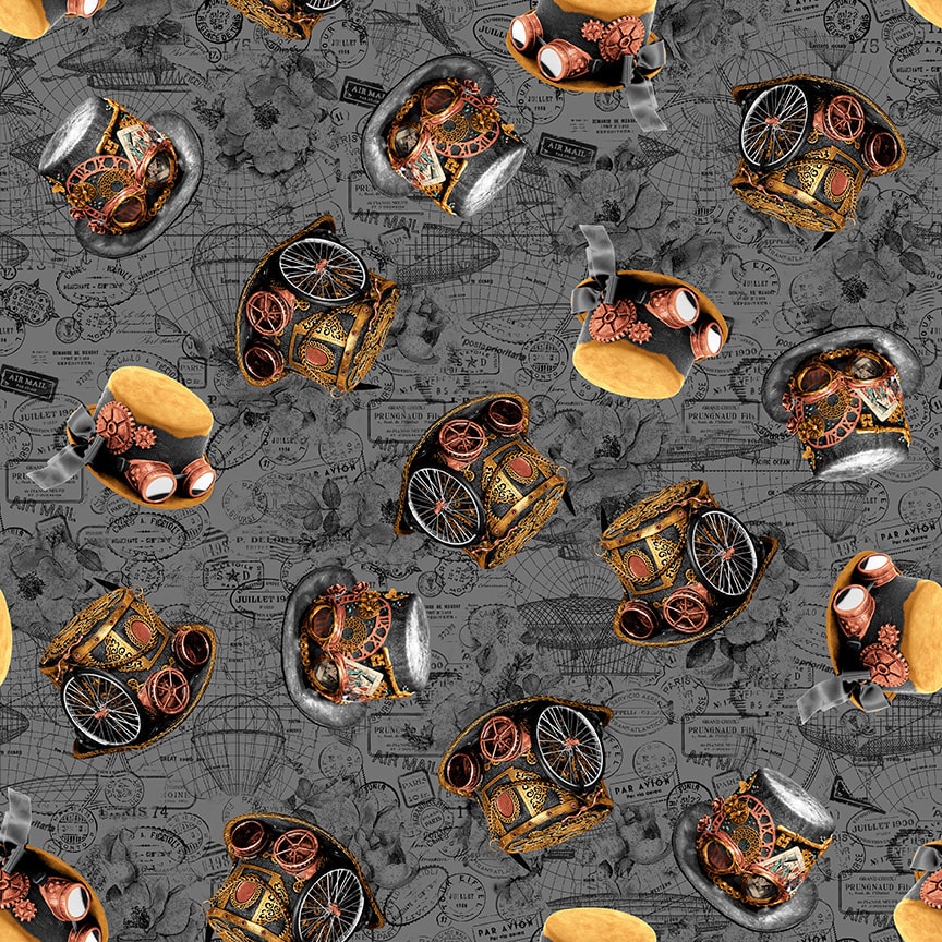 Become a part of the steampunk fantasy world with Urban Essence Designs’ new collection, Time Travel. This group features a 24-inch panel with scenes of vintage hats, airships, bicycles and trains. Other patterns include airships, bees and dragonflies, blueprints, time pieces, gears, hats, keys, pipes, skulls and postal stamps. This collection has a color palette of teals, greys, coppers and bronzes. Accents of golds and black complete the retro-futuristic look of this collection.