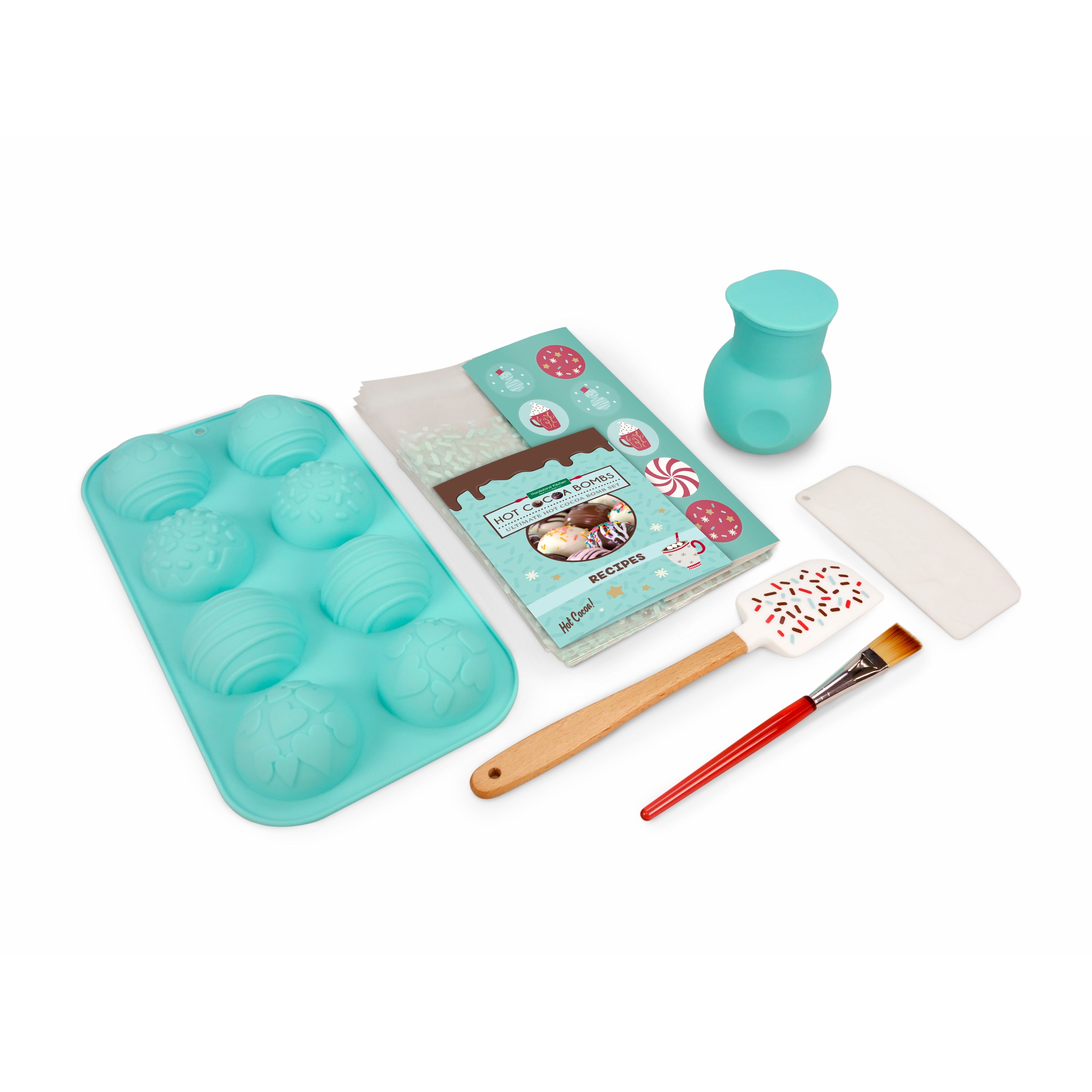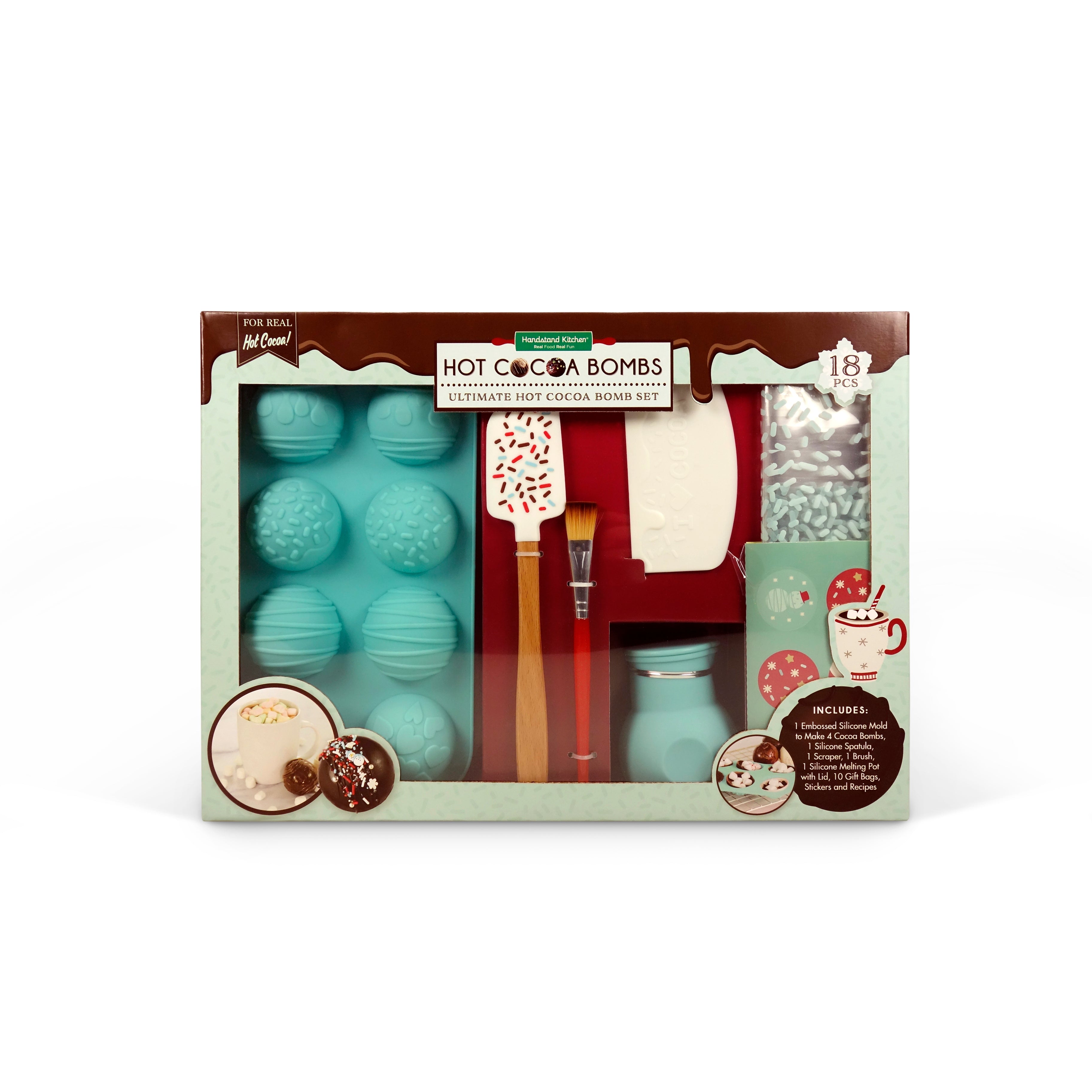 Includes: 1 silicone mold to make 4 cocoa bombs, 1 silicone spatula, 1 chocolate scraper, 1 brush, 1 silicone melting pot with lid, 10 gift bags, stickers and recipes, plus QR code link to more exclusive recipes and videos.