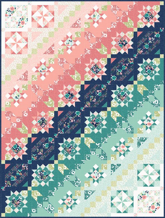 The new Juliette collection by Angela Nickeas for Wilmington Prints is featured in this fun quilt designed for and 8 month block of the month program. The twin quilt is 64 1/2" x 85 1/2" with light and medium teal, dusty peaches, soft greens, a bit of navy blue, & white for a fewsh modern aesthetic. It features a square set diagonal layout of 9" blocks with sashing and a sashing border with no additional borders. This is a great starter project for those who haven't ventured into the world of BOM programs yet & it look beautiful on any twin or guest bed!