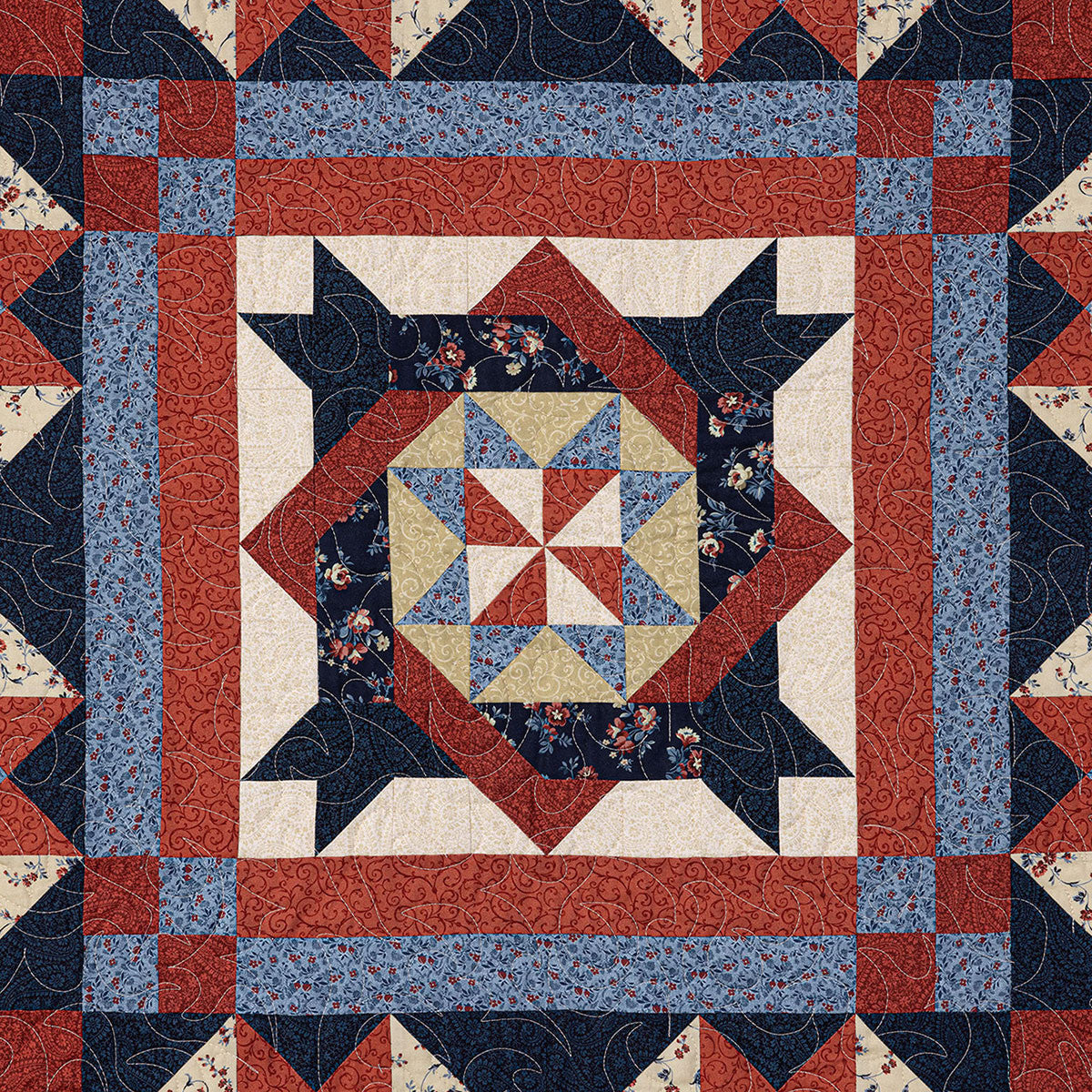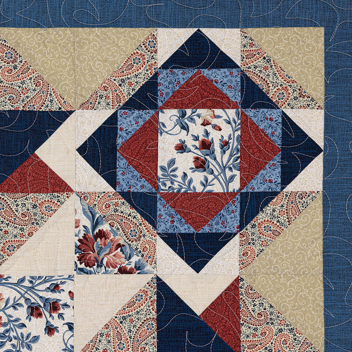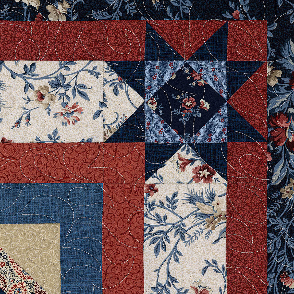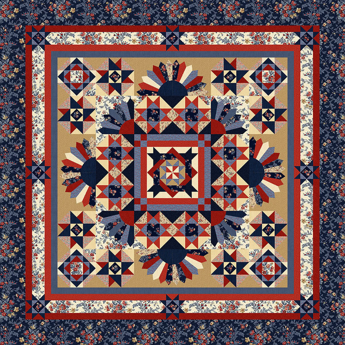 Victory Garden Block of the Month designed by Wing and a Prayer featuring fabrics inspired by French 1890s vintage fabrics with Timeless Treasures. The color palette of red, blue and cream gives the collection an Americana feel with a floral design. The 108" square quilt uses traditional piecing techniques.
