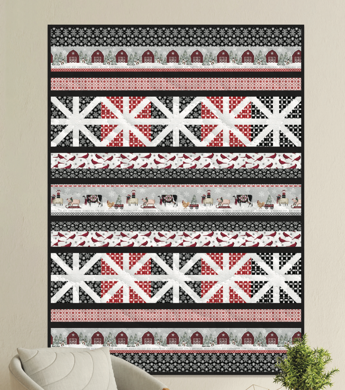 Dianna Swartz is surely an artist for all seasons! Her latest collection “Winter at the Farm” takes farmhouse style and gives it a snowy makeover. The wonderful panel and wide border stripe both feature barns, farm animals and snowmen, along with evergreens and (of course) snow! Tractors, cardinals and beautiful geometrics round out the collection, and the modern meets traditional color palette will fit into any décor