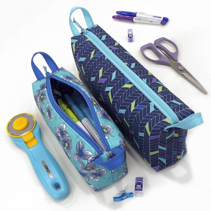 Adorable zip pouches with basket-style zip handles. Perfect for a pencil case, sewing notions, treasures, and more. Grab your favorite fabrics then cut a little, sew a little, zip a little – and done!